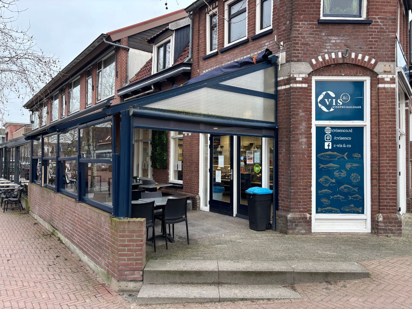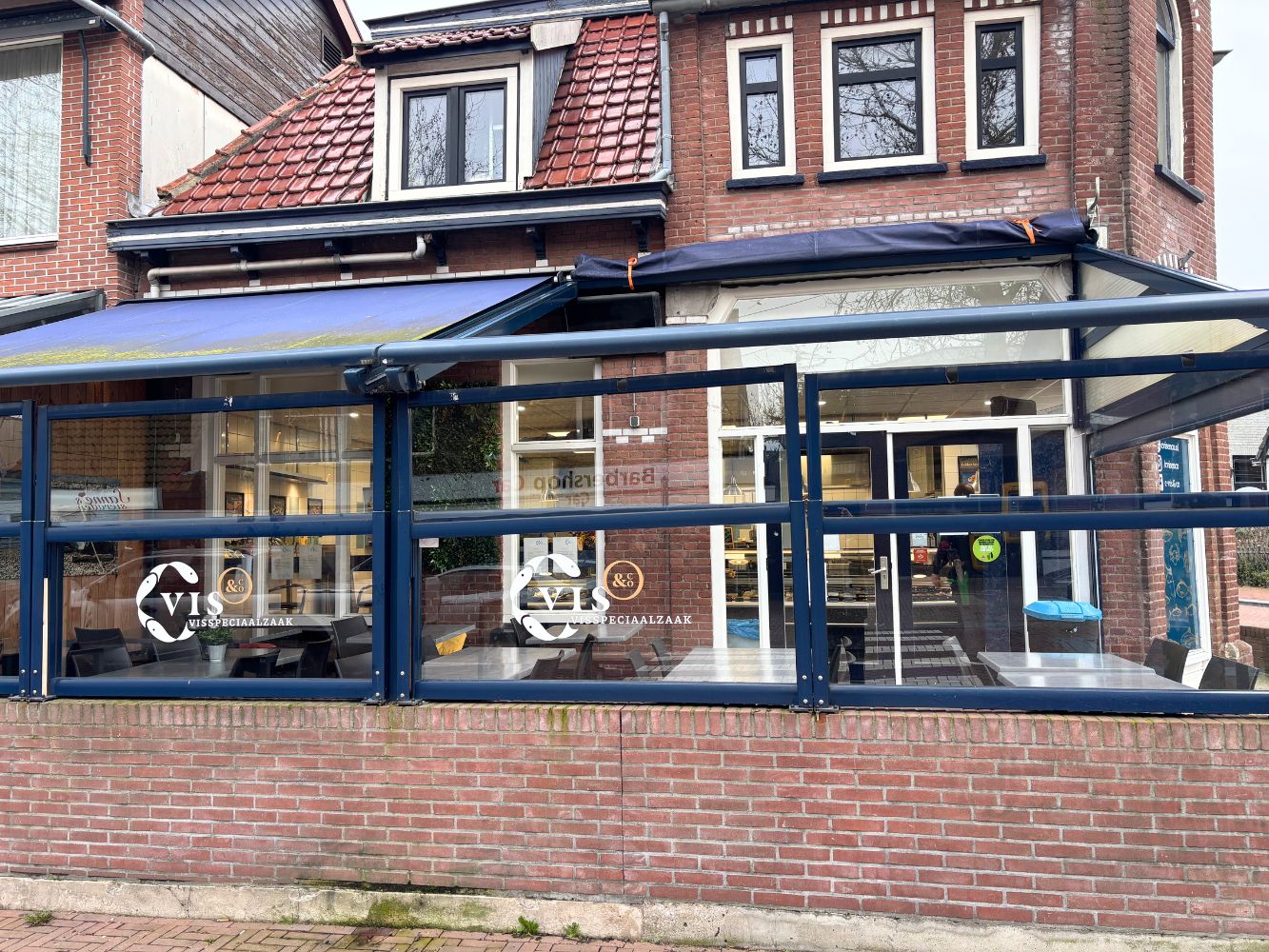 Voor de winkel bevindt zich een ruim overkapt en verwarmd terras, waardoor gasten hier het hele jaar door kunnen genieten van versgebakken vis, vissalades en complete visgerechten.