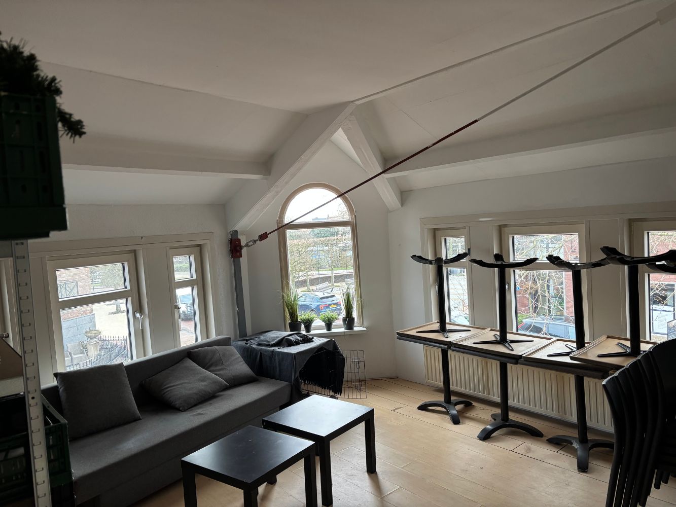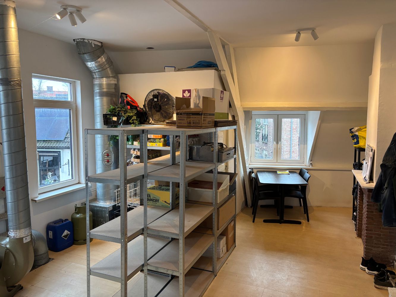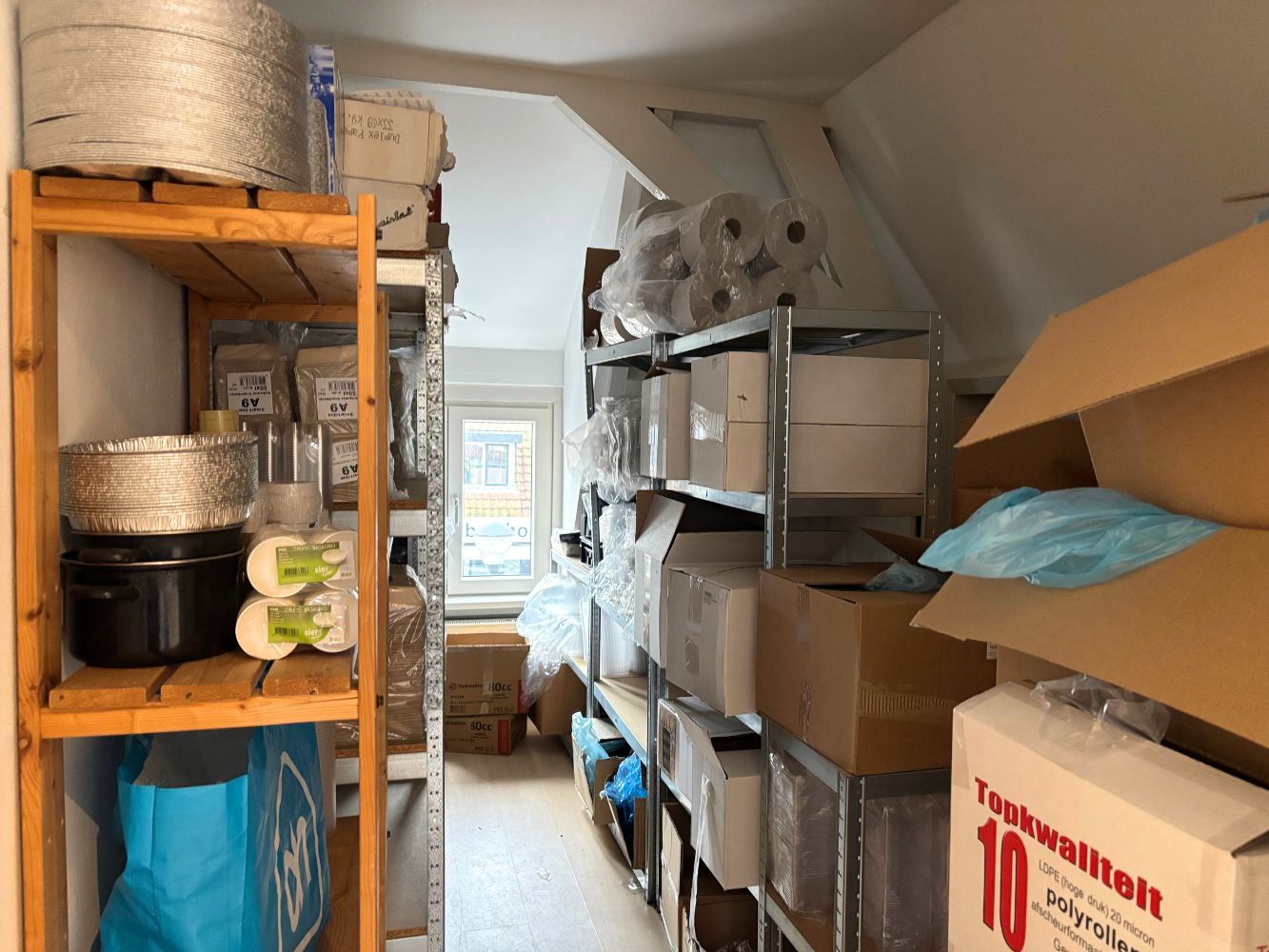 De bovenverdieping is momenteel ingericht als personeelsruimte en magazijn, maar biedt uitstekende mogelijkheden om (gedeeltelijk) als woning te gebruiken.