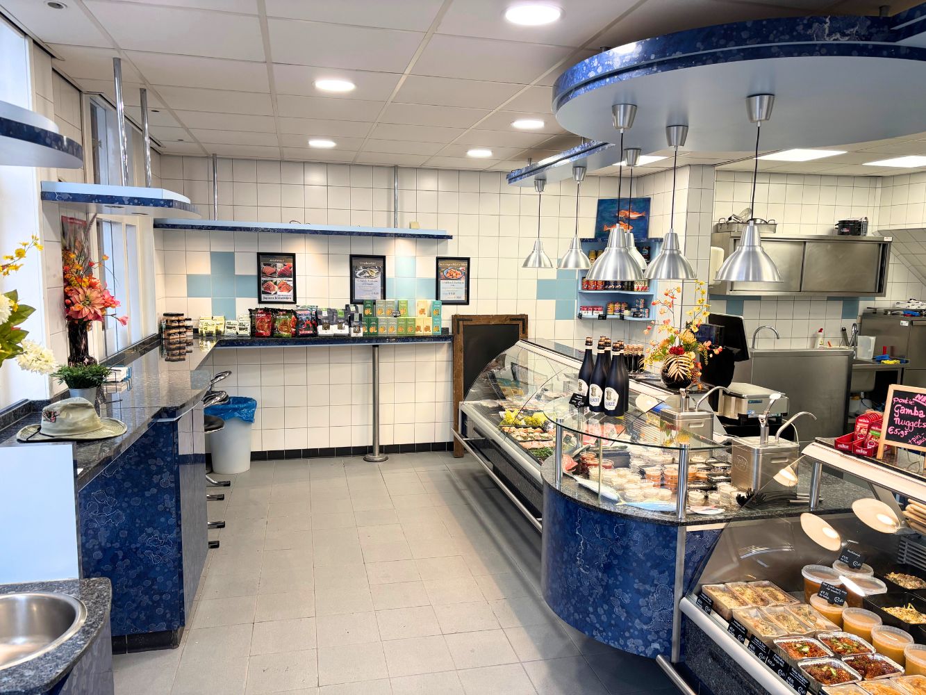 - Een zeer ruime en indrukwekkende vitrine met diverse verse vis en ambachtelijk bereide visgerechten